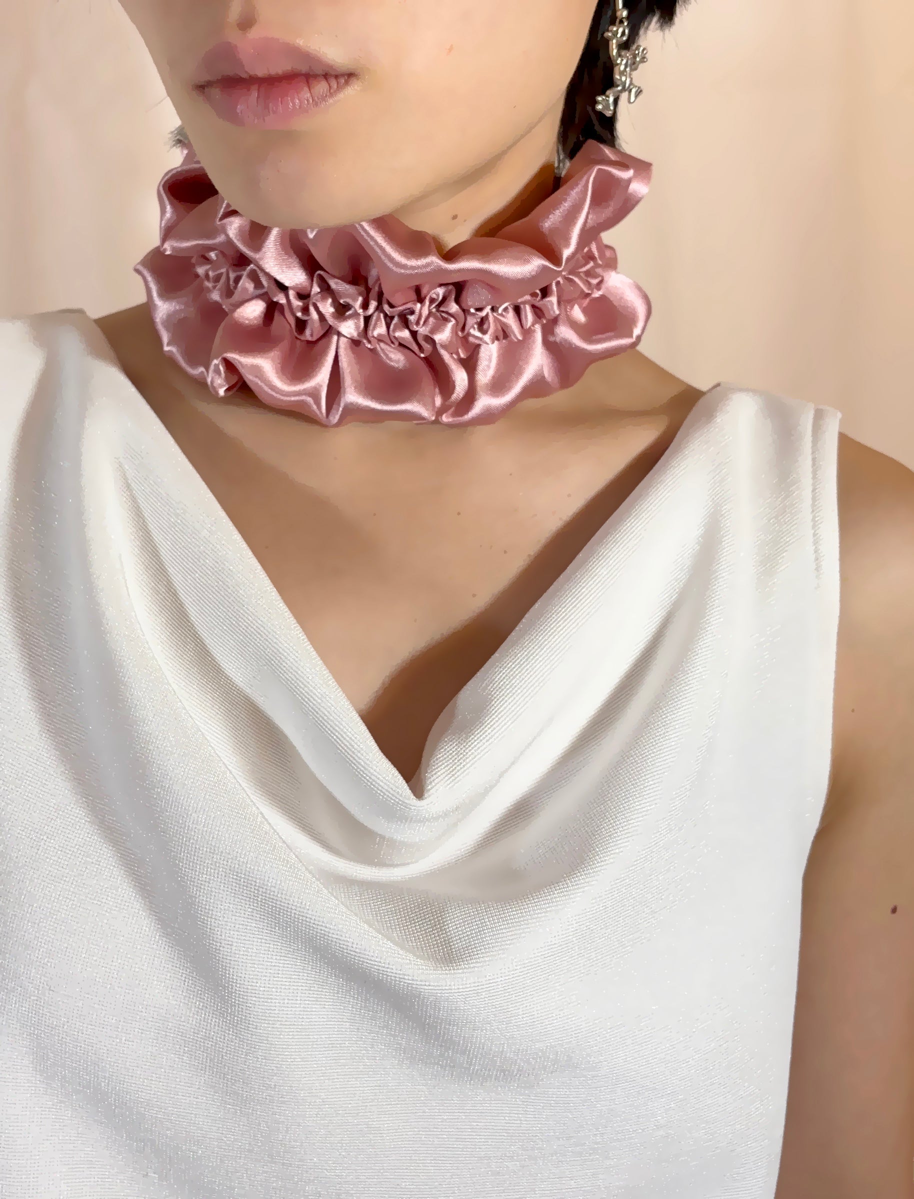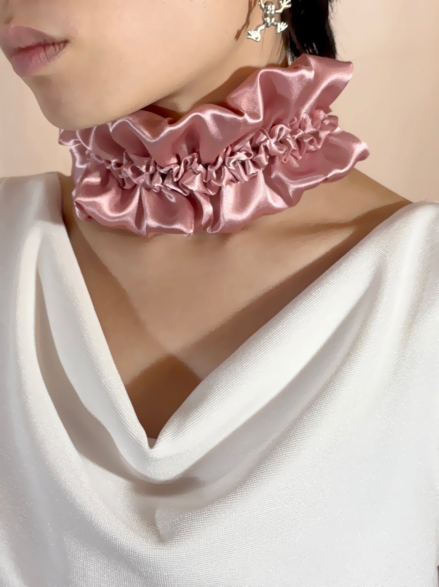 Gently gathered poly satin fabric choker, all in dusty rose color and back closure with snaps.