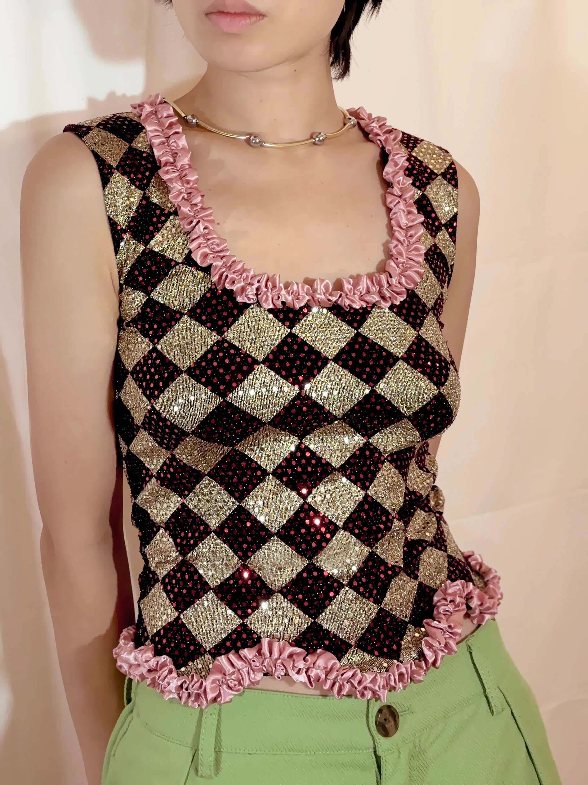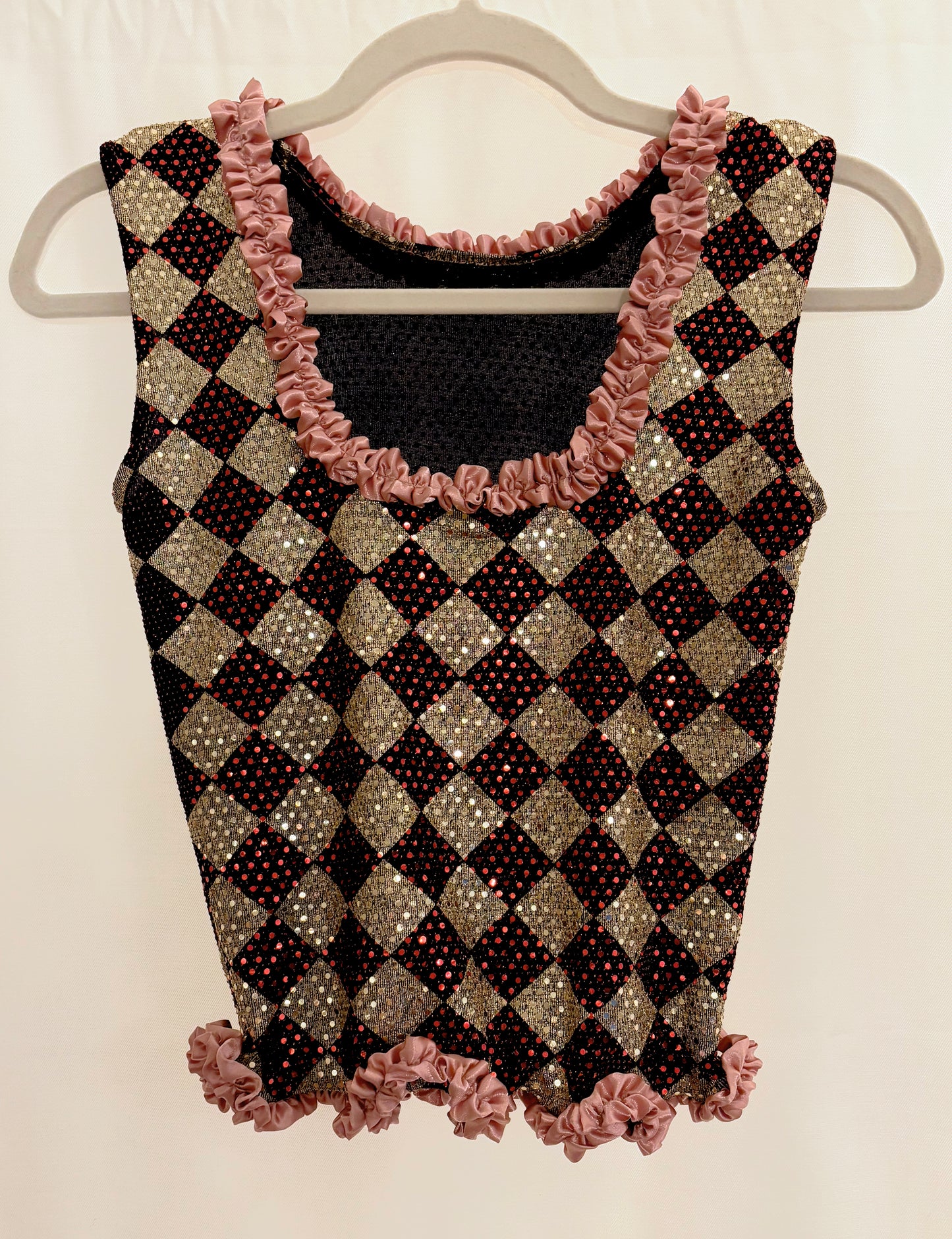 We reimagined Harley Quinn in our romantic fantasy and came up with this Soft Jester Top, with a stretchy gold and red harlequin sequin body and dusty rose gathered trim on the edges. The hem is a bit wavy like the photo. You pull it over your head like a regular top!